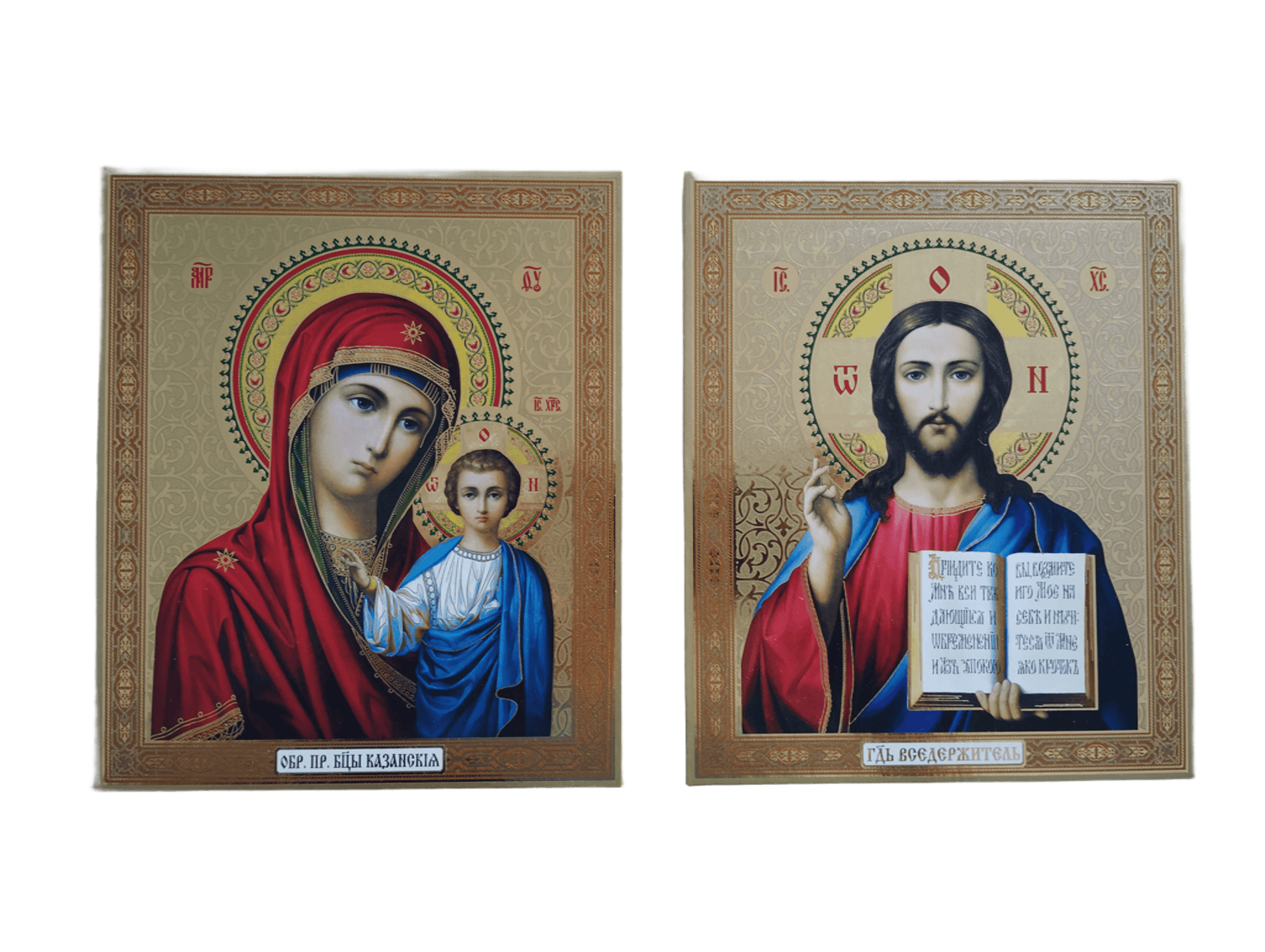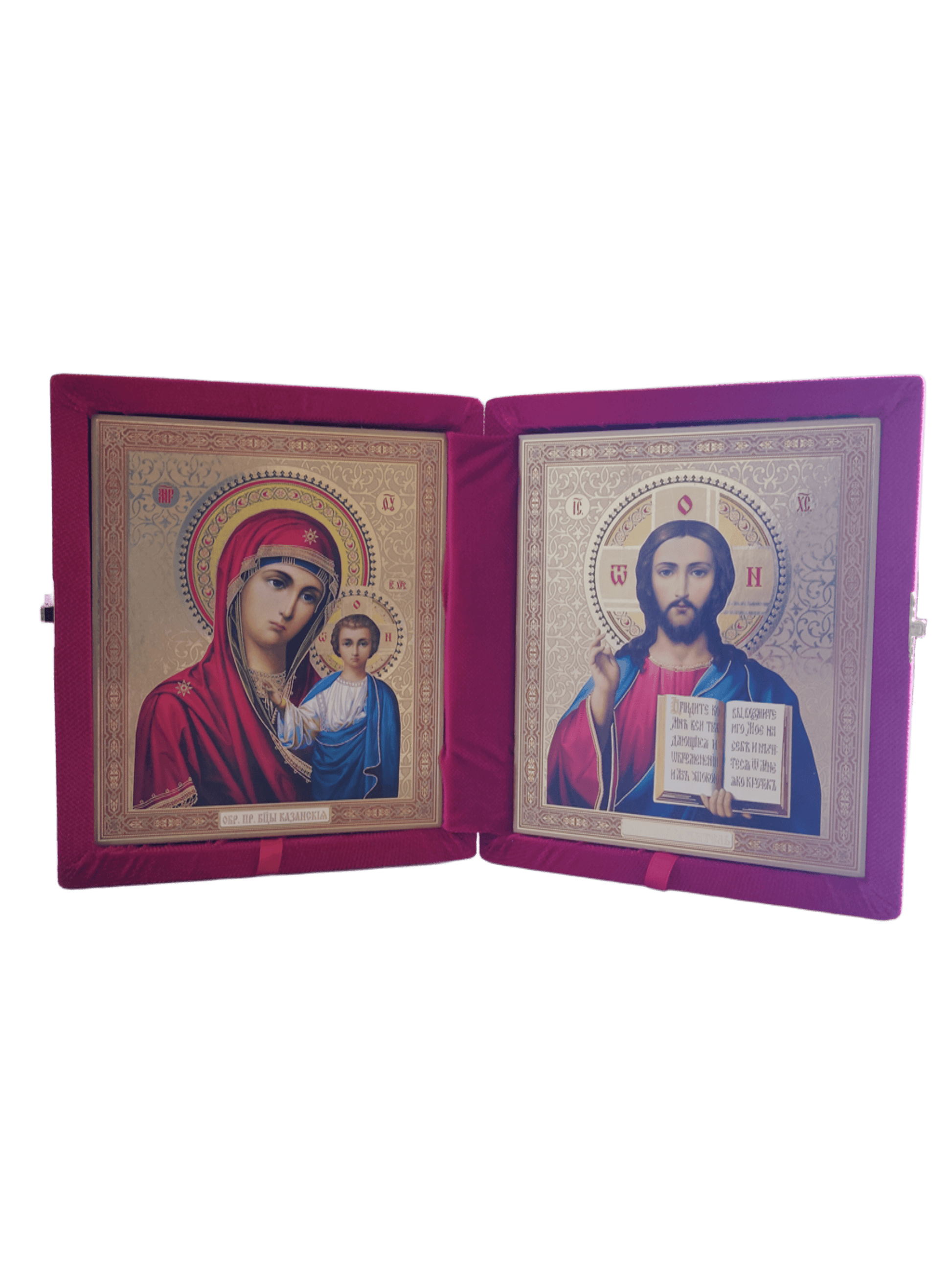 Диптих с образите на Иисус Христос Вседържител и Света Богородица Казанска. Иконите могат да се вадят. Размер в затворено положение 17.5 х 21 см.