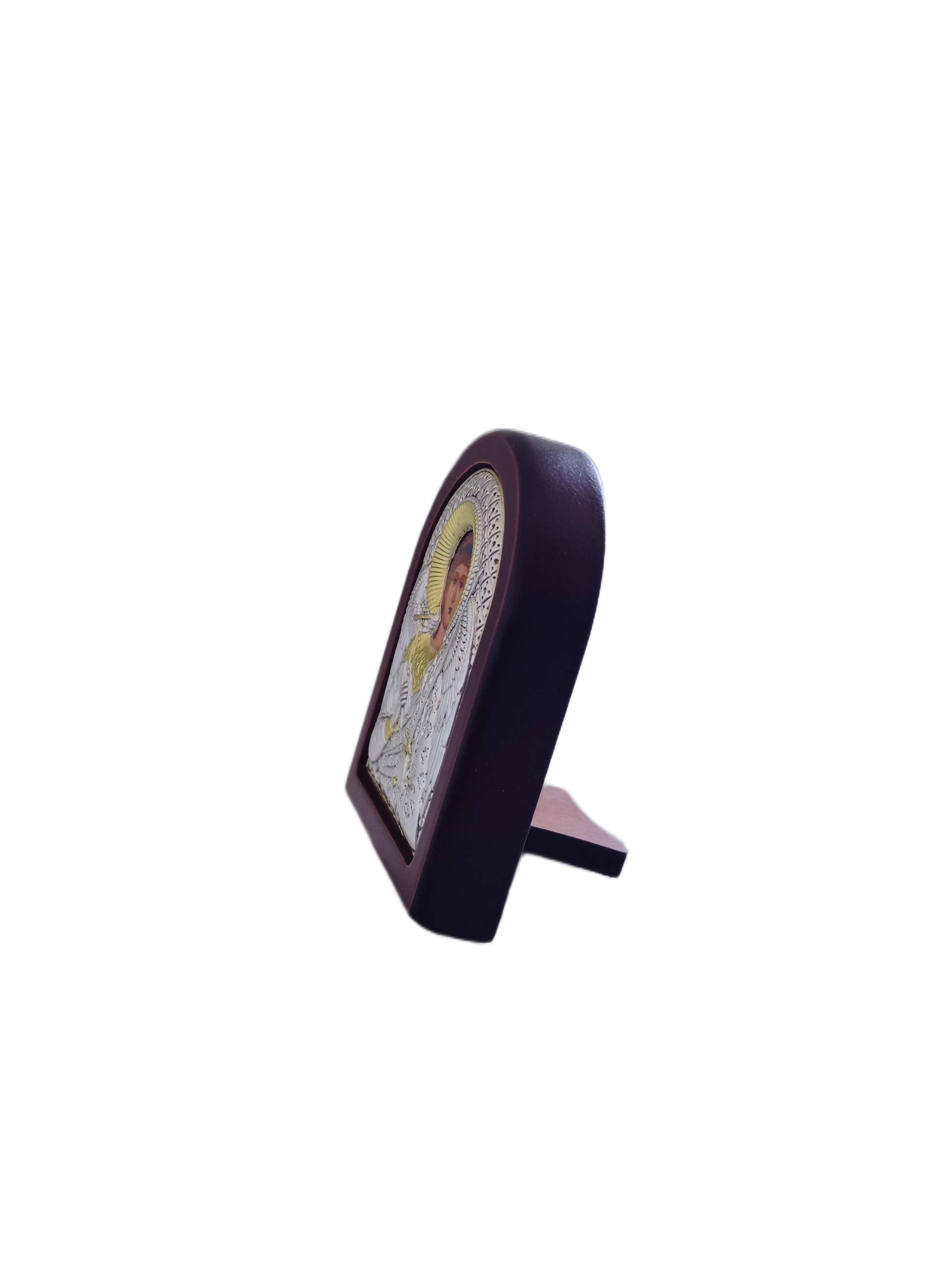 Икона на Ангел Хранител със сребърен обков проба 999 и сертификат. Изработена е на дърво по специална технология. Иконата не старее и не си променя лика с времето.