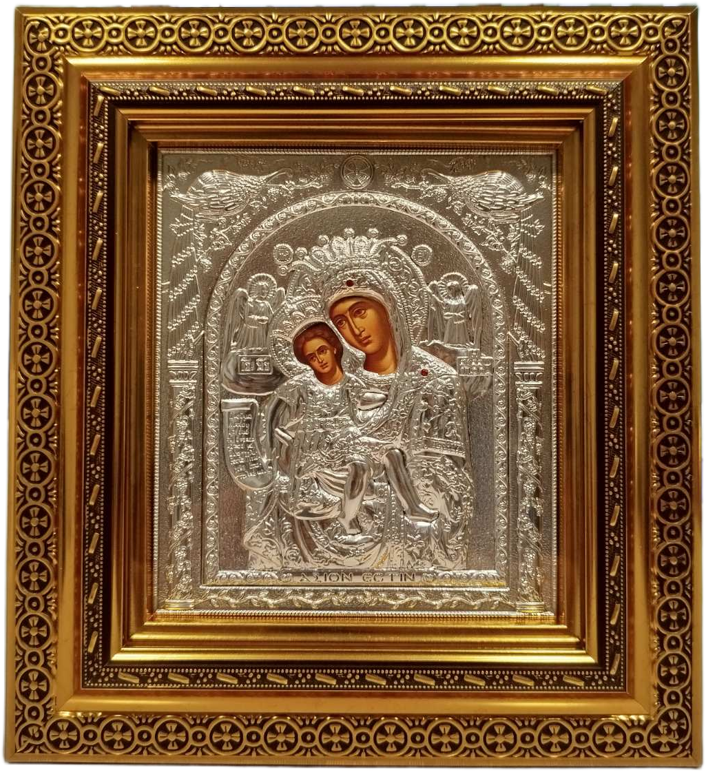 Икона на Св. Богородица Достойно Ест със сребрист фон. Двойна рамка със стъкло.