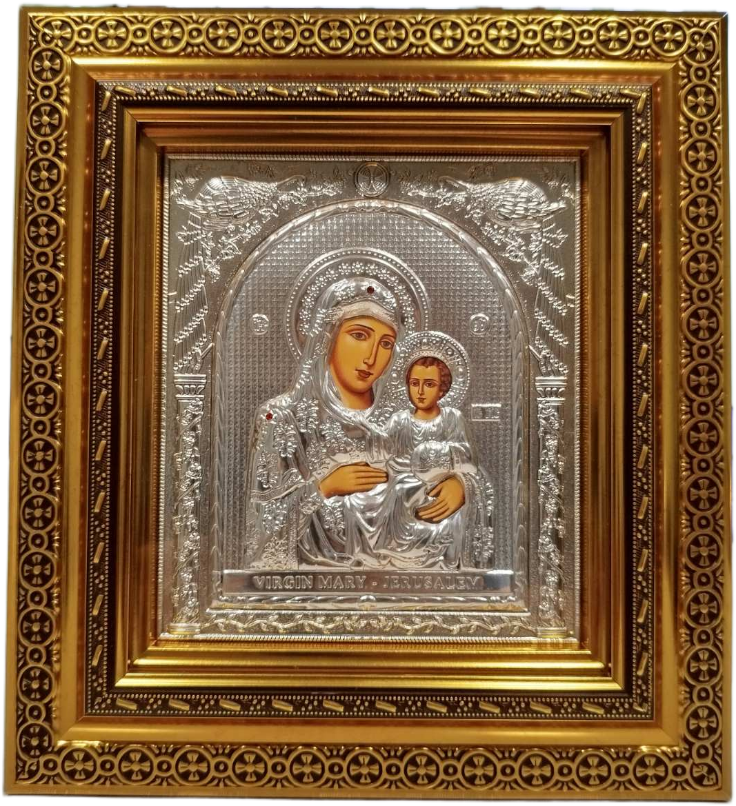 Икона на Св. Богородица Йерусалимска със сребрист фон. Двойна рамка със стъкло.