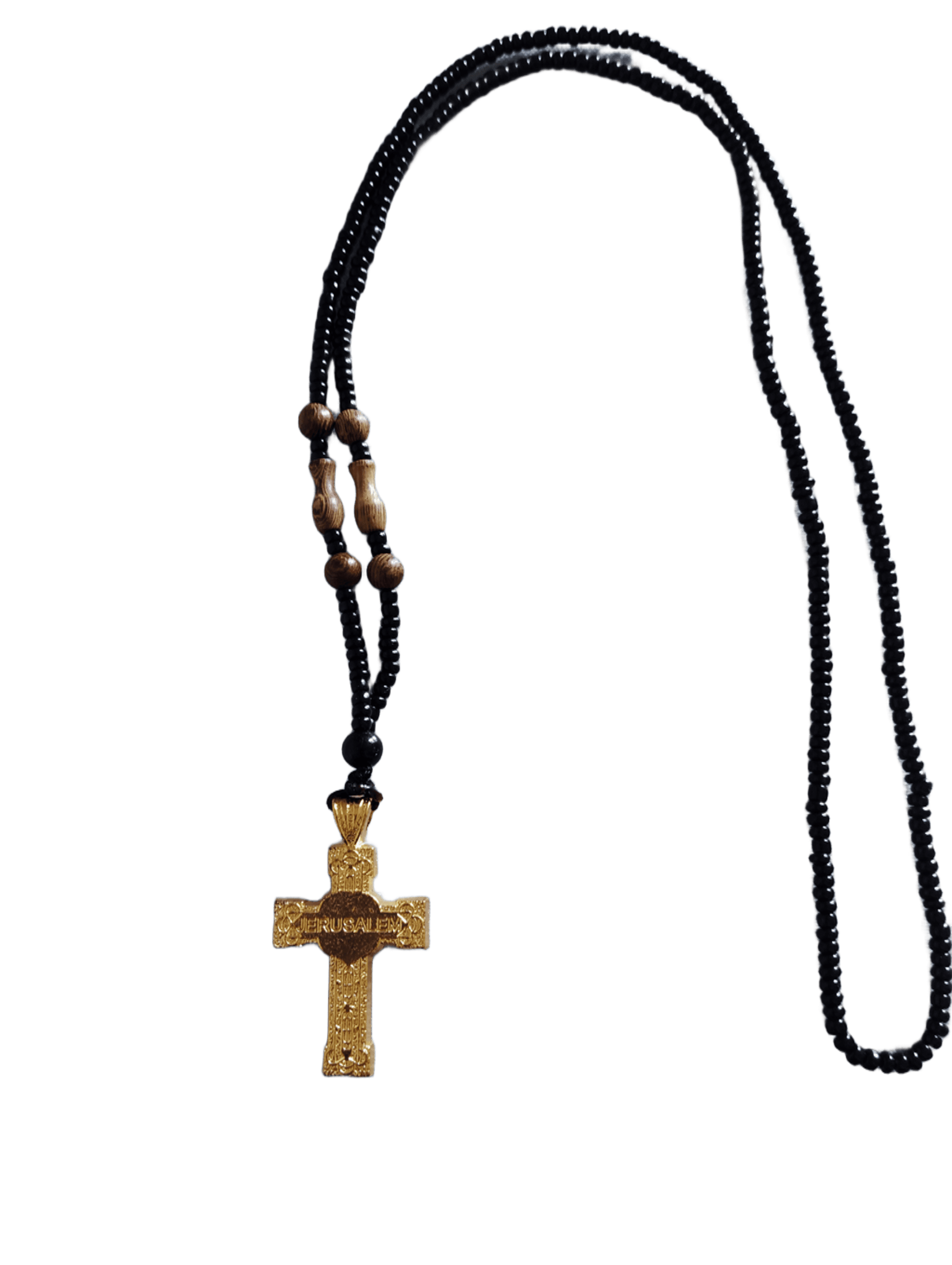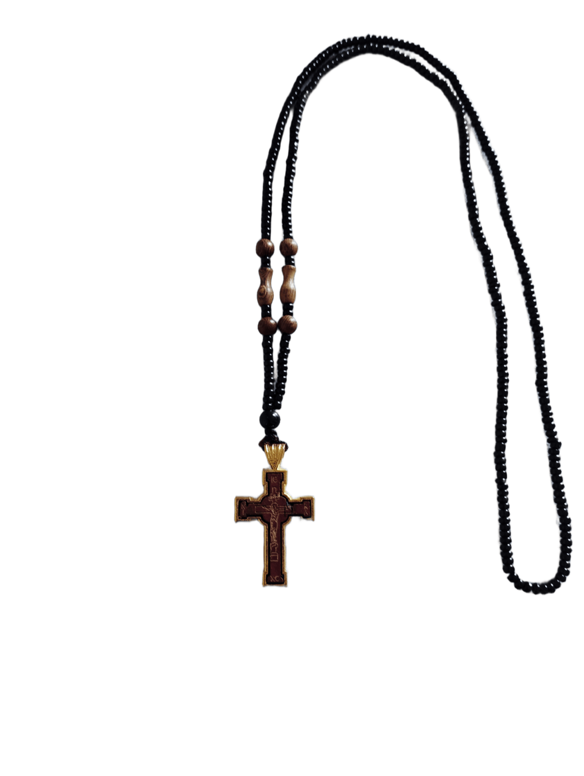Материал - дърво и метал, верижка - мъниста. Размер без кръста 70 см, кръст 2.5 х 3.5 см.
