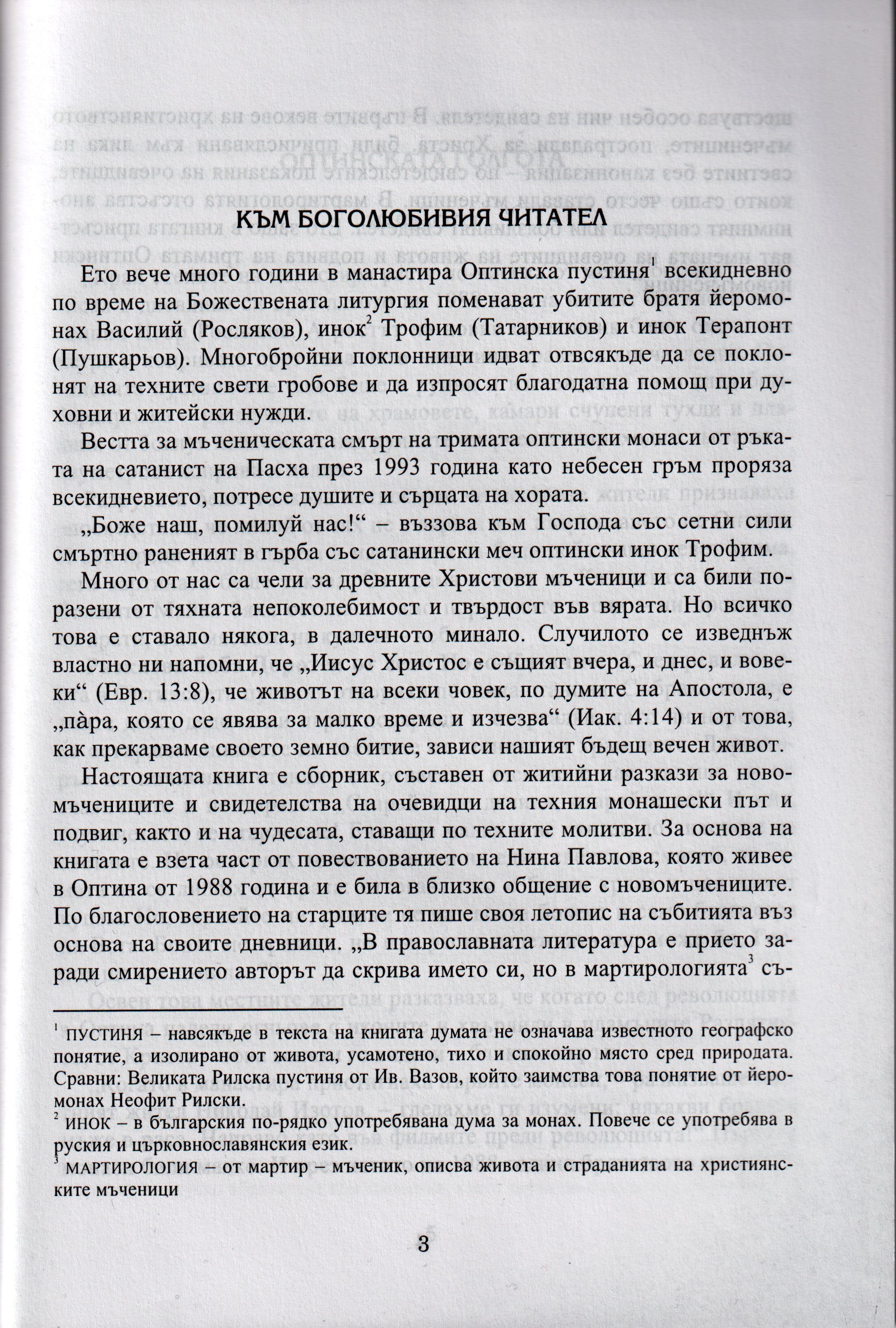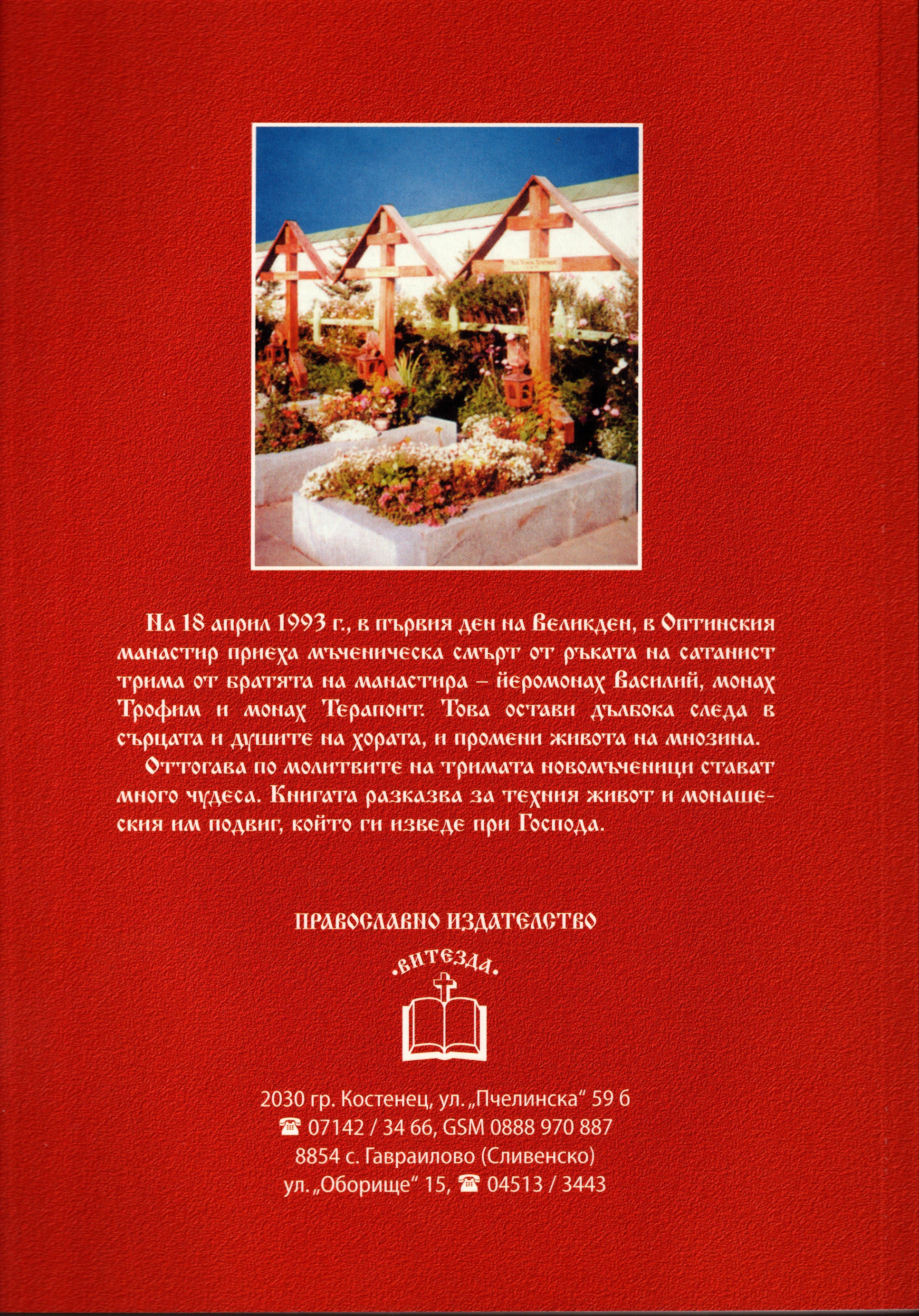 Книгата описва живота на тримата Оптински новомъченици, убити на Великден 1993г.