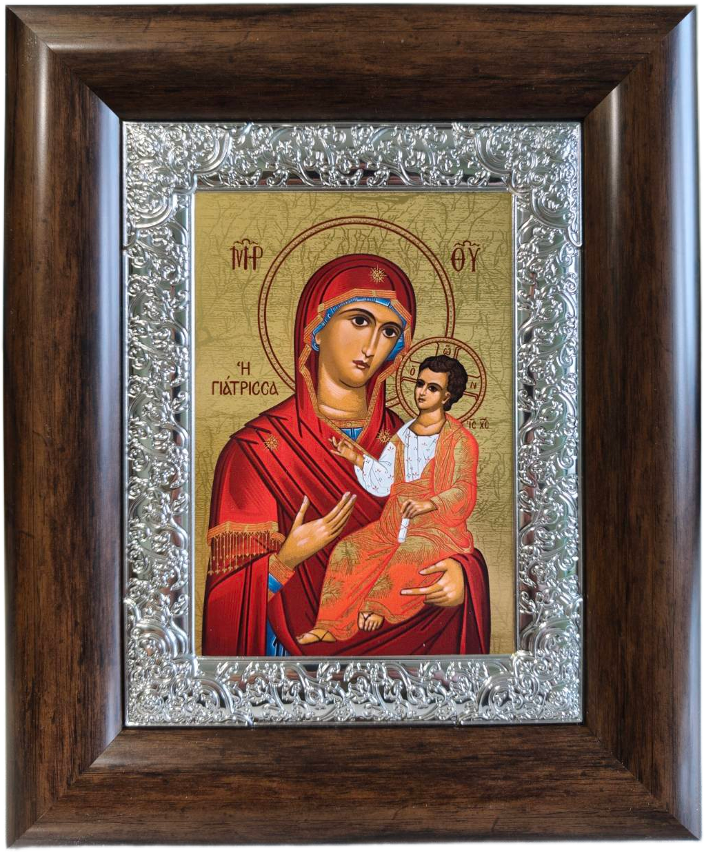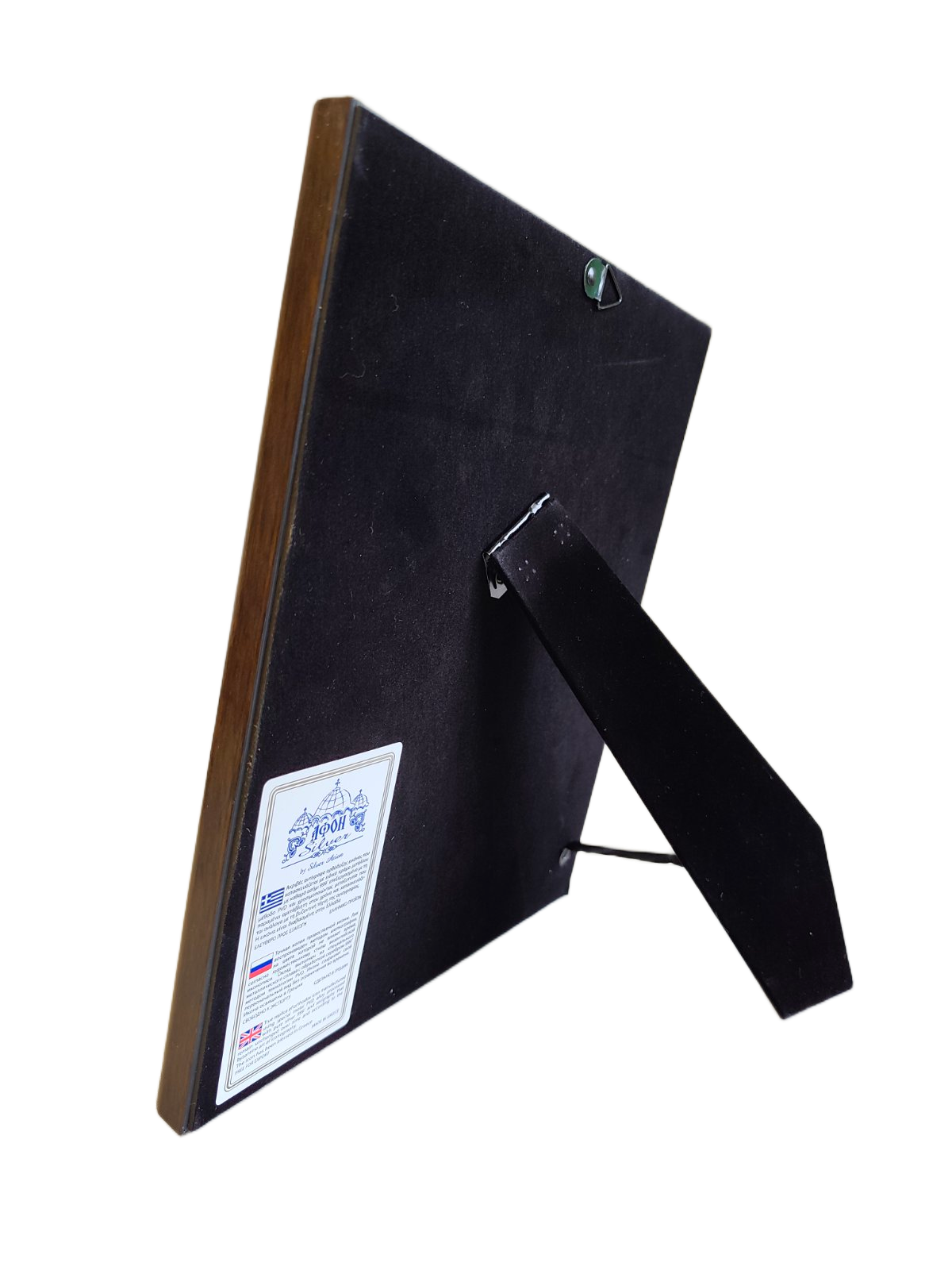 O copie fidelă a unei icoane ortodoxe, realizată dintr-un aliaj metalic special cu argint pur 999, prelucrată prin metoda PVD și serigrafie. Icoana rămâne neschimbată în timp și este realizată conform artei bizantine a iconografiei. Fabricată în Grecia.